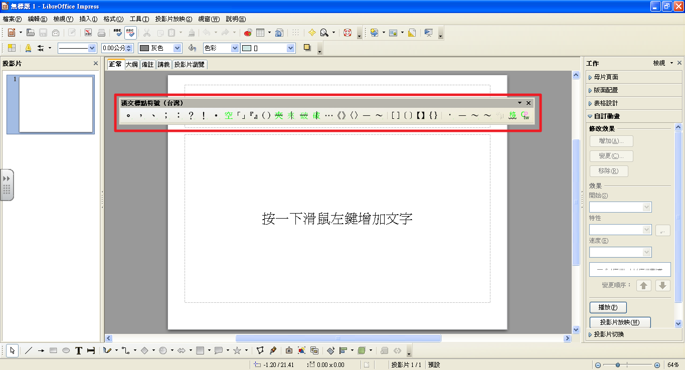 LibreOffice是源於Openoffice.org的一套自由辦公室軟體,功能強大,不過沒有提供中文標點符號,一直是我最大的遺憾,雖有網友提供中文拼點包,可以在writer上使用,但總覺得不方便。近日拜GOOGLE大神,在libreOffice擴充套件庫中找到「ChinesePunctuationTw 1.0.1漢文標點符號(台灣)工具列」擴充套件,不但安裝方便,在LibreOffice的 Calc、Draw、Impress 和 Writer中都可以使用。